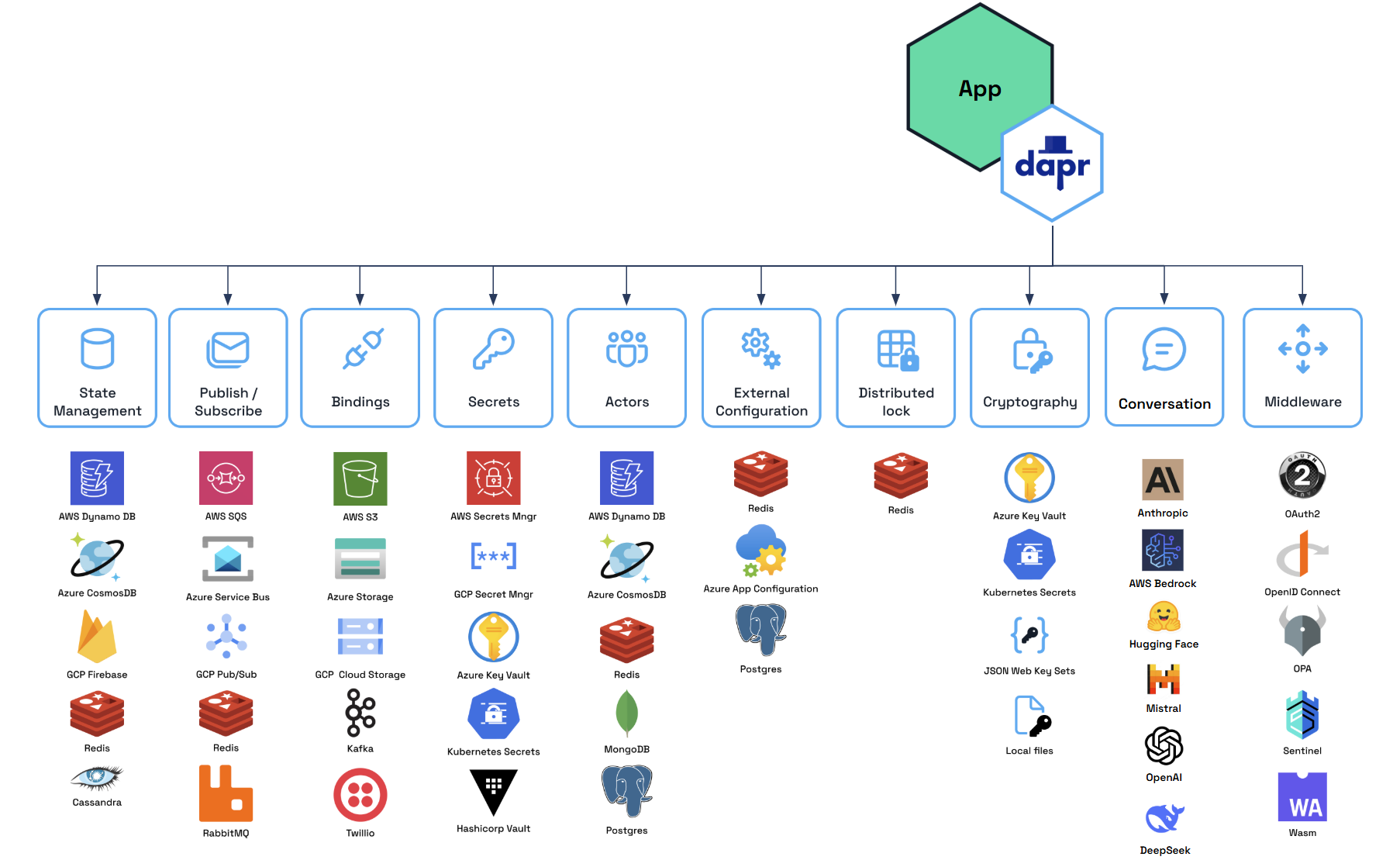 No more boilerplate: Store state through the Dapr API and let the platform team pick Redis, Cosmos DB, DynamoDB, etc. Doing pub/sub messaging? Swap RabbitMQ for Kafka via config, not code.